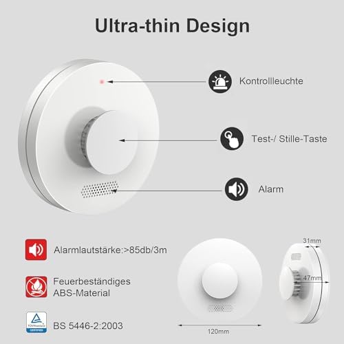 • Modernes, unauffälliges Design: Der ultraflache Brandmelder fügt sich elegant in jedes Wohnzimmer, Schlafzimmer oder Flur ein, ohne aufzufallen.