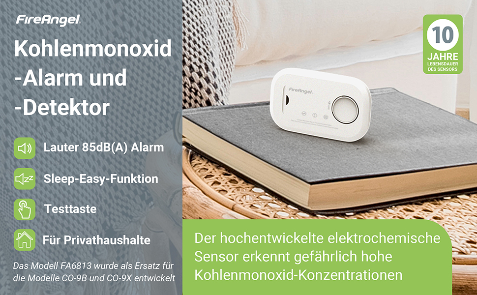 Das Gerät dient als Ersatz für die Fireangel-Modelle CO-9B und CO-9X und bietet Ihnen eine zuverlässige Lösung, um Ihre Familie vor den Gefahren von Kohlenmonoxid zu schützen.