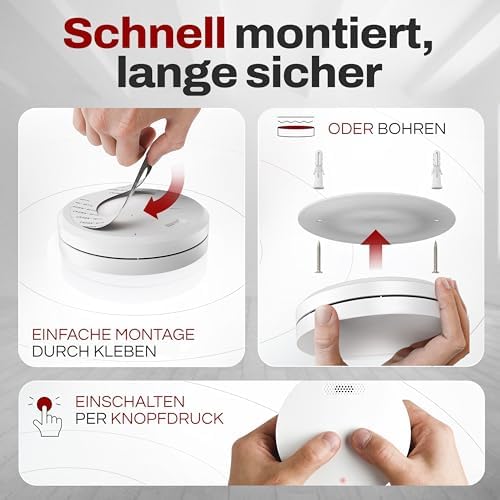 Die Installation könnte nicht einfacher sein! Schalten Sie den Melder ein, kleben oder bohren Sie ihn an die gewünschte Stelle – und schon sind Sie geschützt. Dank der langlebigen 10-Jahres-Batterie sind Sie für die gesamte gesetzlich vorgeschriebene Zeit ohne zusätzliche Wartung sicher.