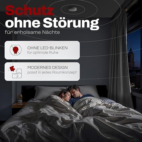 Besonders für Schlafzimmer geeignet, stört unser Rauchmelder nicht mit lästigem LED-Blinken. Genießen Sie ungestörte Nächte und das beruhigende Gefühl, dass Ihre Sicherheit auch im Schlaf gewahrt bleibt. Vertrauen Sie auf einen Feuermelder, der Ruhe und Sicherheit kombiniert.