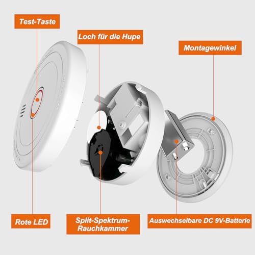 Ein besonderes Feature ist die praktische Test-Taste, mit der Sie den Rauchmelder einmal im Monat überprüfen können. Zudem signalisiert der Alarm bei niedrigem Batteriestand, sodass Sie immer informiert sind, ob der Rauchmelder betriebsbereit ist.