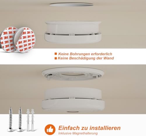 Die Installation dieses Produkts ist kinderleicht und erfordert keine speziellen Werkzeuge. Mit Hilfe der praktischen Magnetplatte können Sie den Rauchmelder problemlos anbringen, ohne die Wand zu beschädigen. So gelingt die Montage schnell und unkompliziert, und Sie können sofort für Ihre Sicherheit sorgen.