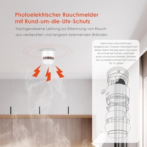 Der Mini-Rauchmelder nutzt fortschrittliche fotoelektrische Sensoren, die in der Lage sind, Rauchpartikel von Schwelbränden schnell zu erkennen. Diese präzise Erkennung sorgt dafür, dass Ihr Zuhause und Ihre Familie zuverlässig vor den Gefahren von Rauch und Feuer geschützt sind, wobei die Anzahl der Fehlalarme minimiert wird.