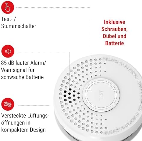 Im Falle eines Brandes zählt jede Sekunde. Der Rauchmelder alarmiert mit beeindruckenden 85dB in einer Entfernung von 3 Metern. Mit dem integrierten Test- und Stummschalter können Sie die Funktion des Geräts ganz einfach überprüfen, um sicherzustellen, dass es immer betriebsbereit ist.