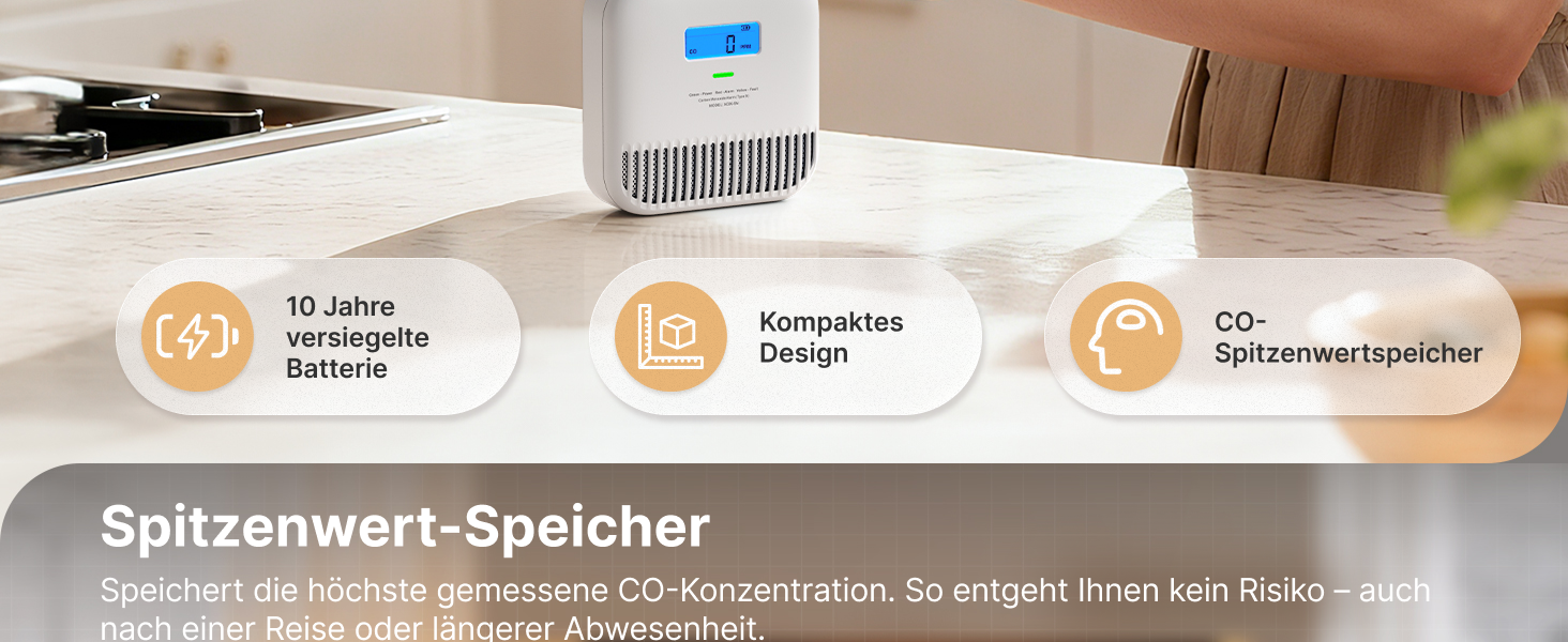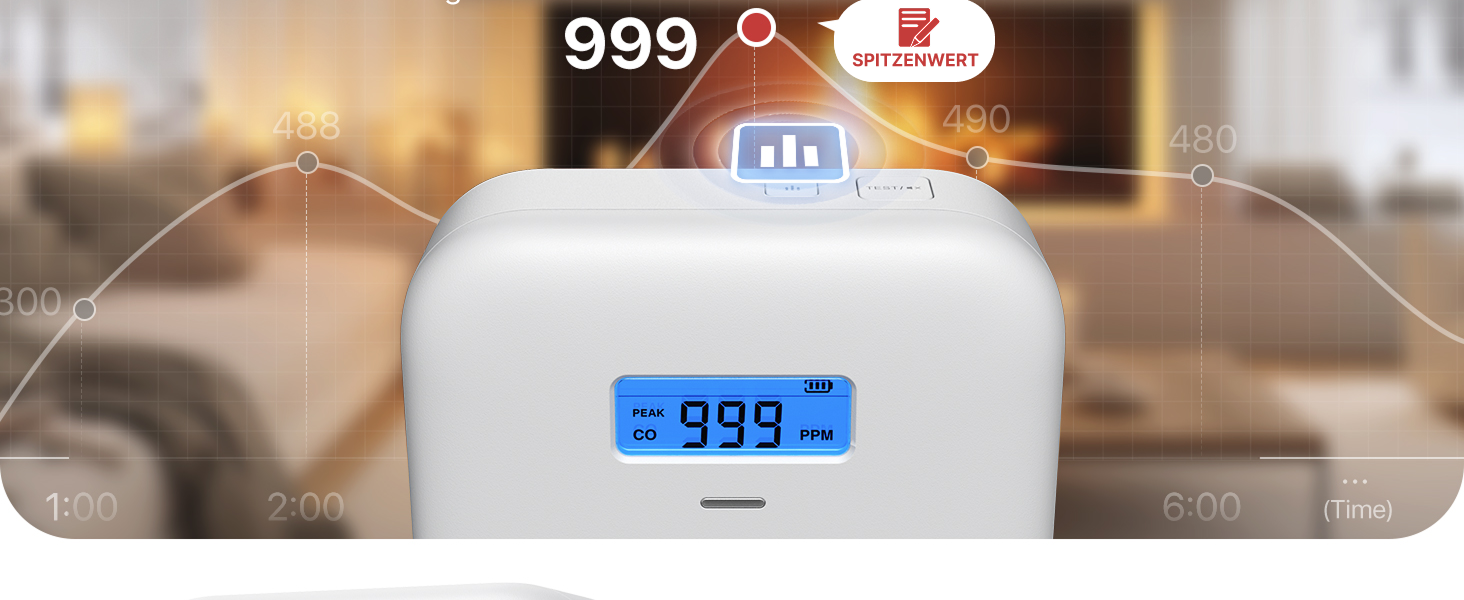 Mit der exklusiven Spitzenwert-Taste können Sie mit nur einem Tastendruck den höchsten seit dem letzten Reset gemessenen CO-Wert abrufen. Dies erlaubt Ihnen, mögliche Risiken sofort zu erkennen, selbst wenn Sie längere Zeit abwesend waren. Diese Funktion ist besonders praktisch für vielreisende Personen oder für Menschen, die häufig unterwegs sind.