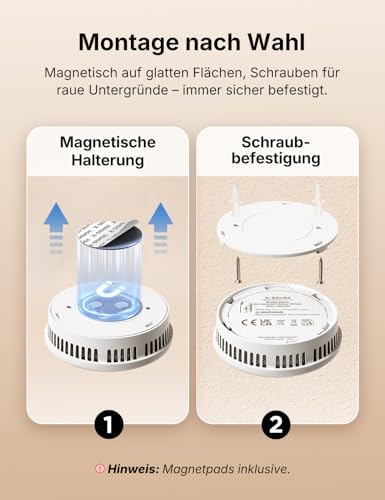 Die Installation könnte nicht einfacher sein! Dank der mitgelieferten magnetischen Pads kann der Rauchmelder mühelos an glatten Oberflächen angebracht werden. Für raue Wände stehen Schrauben zur Verfügung, die ebenfalls im Set enthalten sind. Werkzeuge sind nicht erforderlich – Sie sparen Zeit und Mühe.