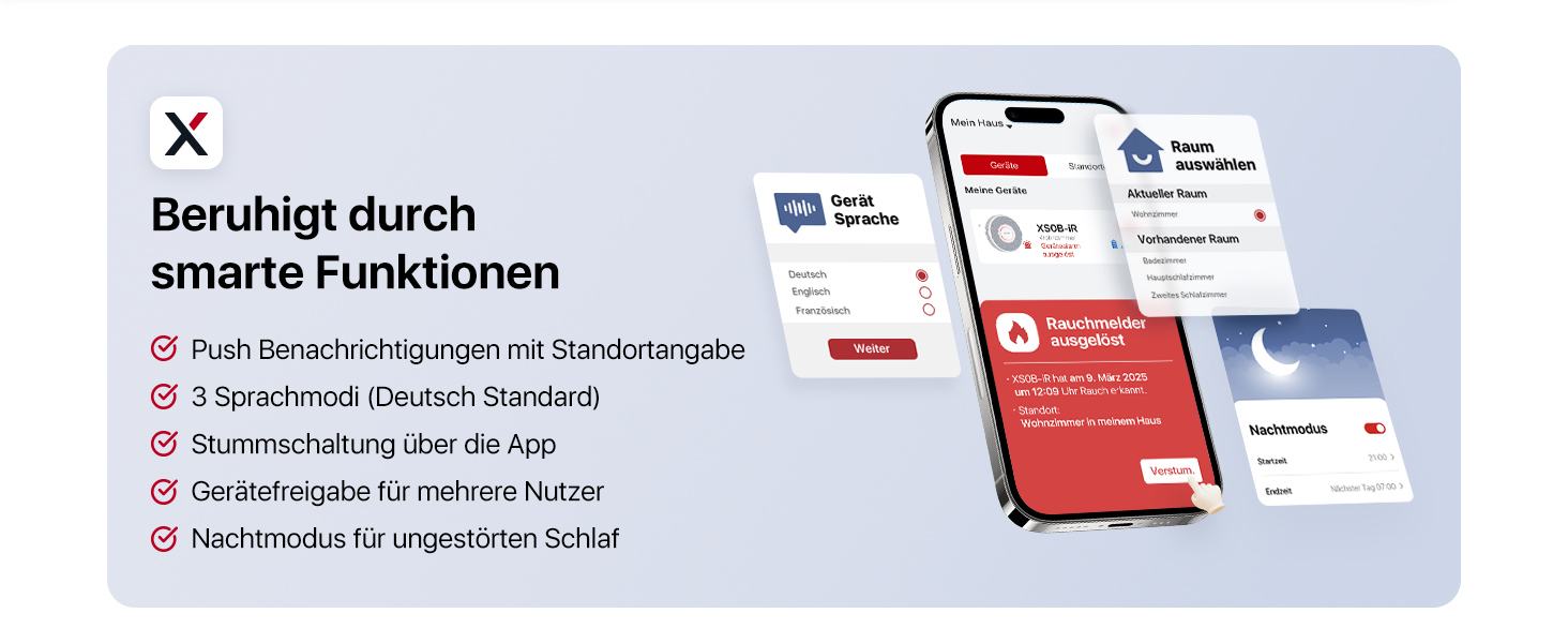 - Intelligente WLAN-Verbindung: Der XS0B-iR Rauchmelder benötigt keine Basisstation, was eine einfache Installation und Handhabung ermöglicht.
