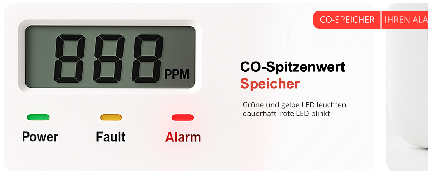 • CO-Spitzenwertspeicher: Historie der höchsten gemessenen CO-Werte wird gespeichert, damit Nutzer auf frühere Alarmierungen zurückgreifen können.